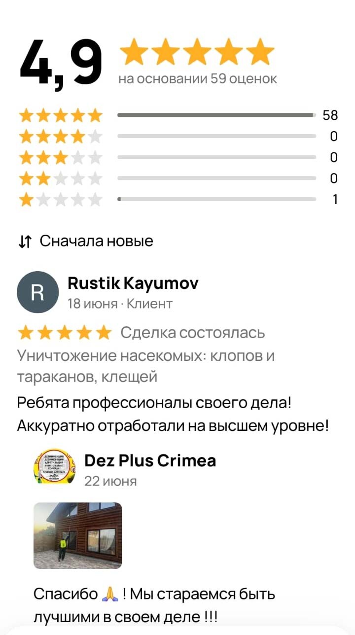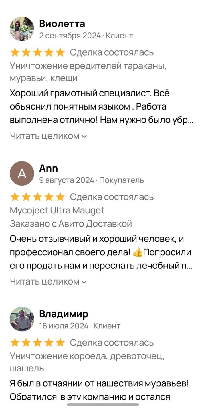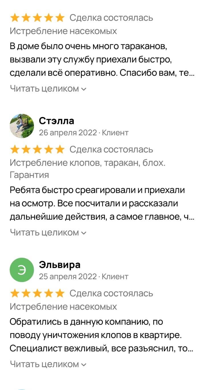 Хочу выразить благодарность Анне Курочкиной за то, что она мне объяснила на пальцах, как можно вытравить тараканов из квартиры и дала дальнейшую инструкцию по тому, чтобы они не появлялись у меня больше. После заказа обработки мастер приехал на следующий день как и договаривались, произвел обработку минут за 30-40. Я расчитался и мы ушли из дома. По возвращению были в шоке, куча мертвых тараканов валялась на полу, были и еле живые, которые ползали. Уборку сделали по инструкции. Тараканы исчезли, но не все! Обратились еще раз, приехали и обработали бесплатно по гарантии. На момент записи отзыва прошло 6 месяцев, тараканов так и нет. Из недостатков это резкий запах, когда вернулся после обработки, он стоял сильный. Но после проветривания исчез в течение дня. Однозначно доволен обработкой. Рекомендую.