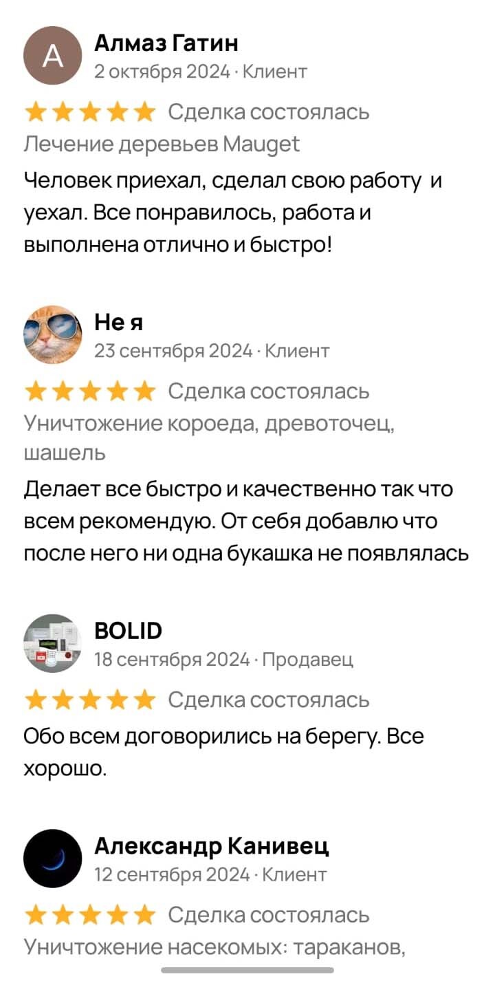 Нас одолели постельные клопы. Чем мы только их не травили, результата не было: покупали отпугиватели Пест Реппелер, которые включаются в розетку, все возможные препараты которые продаются в супермаркете, даже настойку Чистотела использовали, не помогало. Как мне объяснили, мало убить особей, нужно еще и убить яйца клопов. Чтобы это сделать, остаточный эффект от препарата должна быть как минимум месяц. После обработки, ситуация нормализовалась, клопы исчезли. Из плюсов хочу отметить, что мастер помог отодвинуть мебель, т.к. у меня болит спина и я не могла двигать ее сама. И установил мне решетки в ванную и кухню. Спасибо, я довольна!