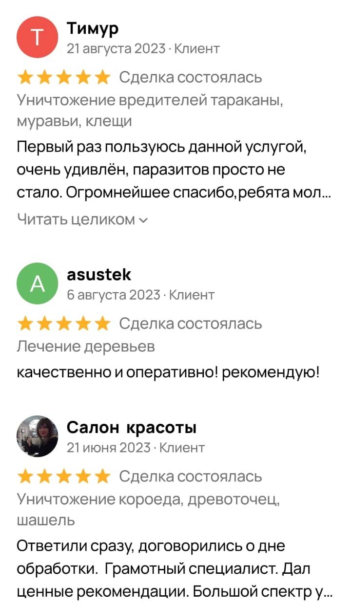Хочу выразить благодарность Анне Курочкиной за то, что она мне объяснила на пальцах, как можно вытравить тараканов из квартиры и дала дальнейшую инструкцию по тому, чтобы они не появлялись у меня больше. После заказа обработки мастер приехал на следующий день как и договаривались, произвел обработку минут за 30-40. Я расчитался и мы ушли из дома. По возвращению были в шоке, куча мертвых тараканов валялась на полу, были и еле живые, которые ползали. Уборку сделали по инструкции. Тараканы исчезли, но не все! Обратились еще раз, приехали и обработали бесплатно по гарантии. На момент записи отзыва прошло 6 месяцев, тараканов так и нет. Из недостатков это резкий запах, когда вернулся после обработки, он стоял сильный. Но после проветривания исчез в течение дня. Однозначно доволен обработкой. Рекомендую.